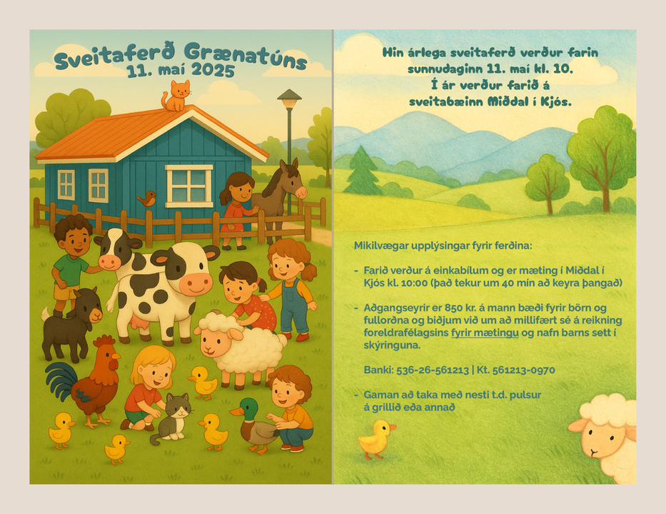 Hin árlega sveitaferð foreldrafélags Grænatúns verður farin sunnudaginn 11. mái kl.10.00. Í ár verður farið á sveitabæinn Miðdal í Kjós.